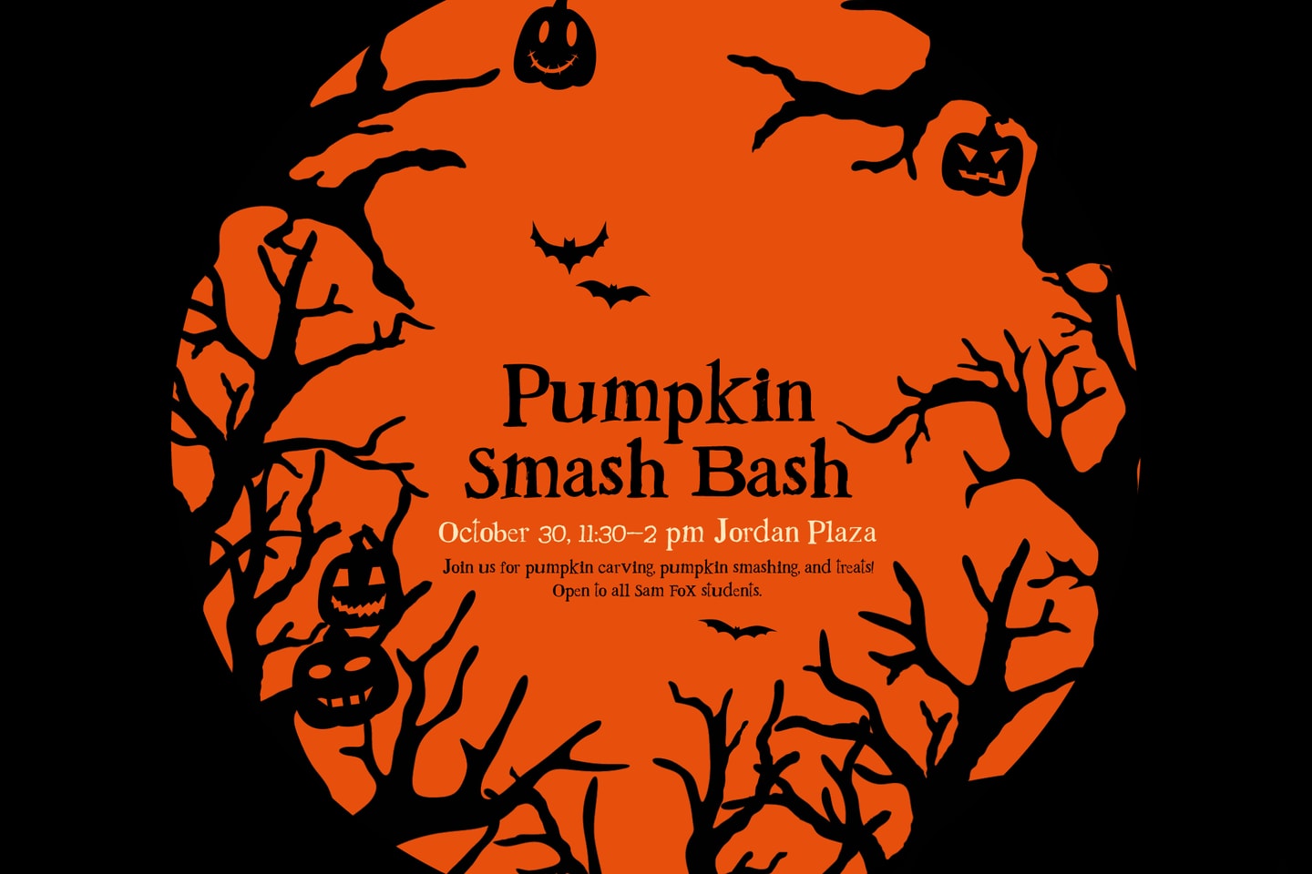 You are invited to the Sam Fox School Halloween Extravaganza! There will be Pumpkin carving, pumpkin smashing, hot cider, donuts, and spooky tunes!