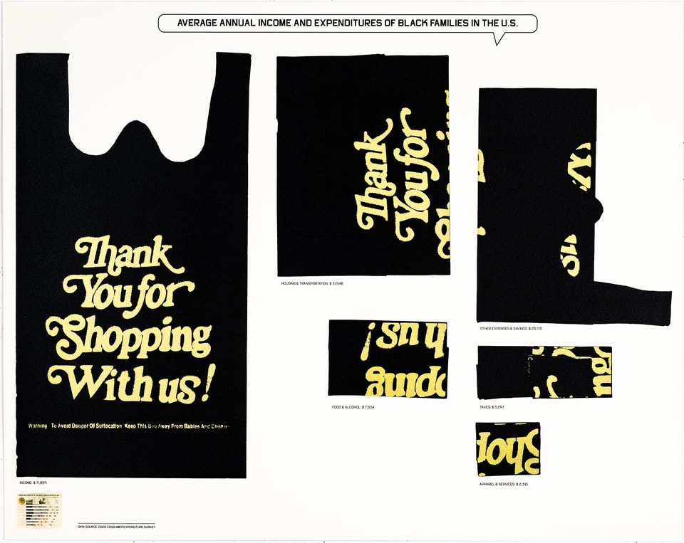 Average Annual Income and Expenditures of Black Families in the U.S., screenprinting, archival pigment printing, and collage on Saunders Waterford paper