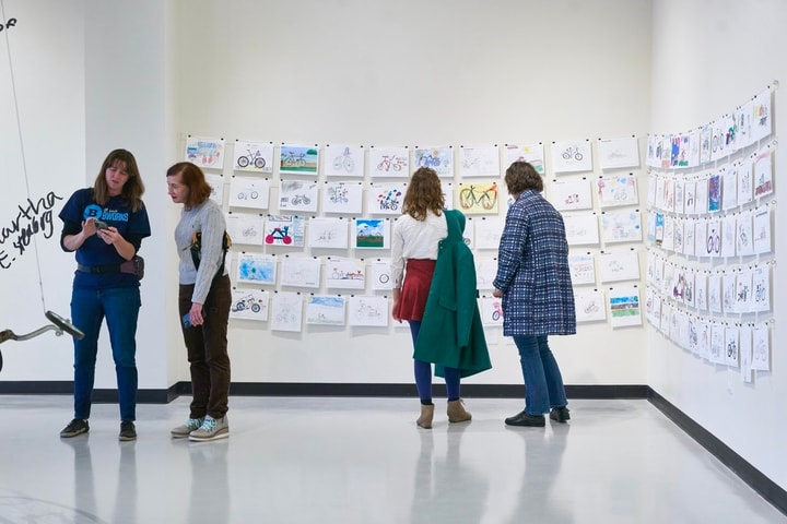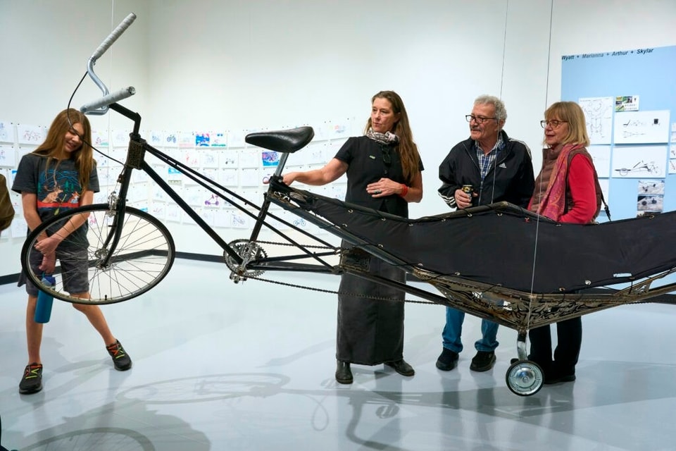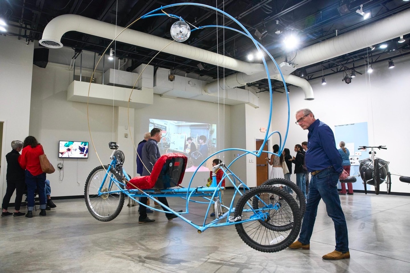 Following “Lucky 13,” the gallery featured work from Senior Lecturer Lindsey Stouffer’s course, “Dream Machines,” on view through Dec. 6. The course, funded in part by the school’s Office for Socially Engaged Practice, partnered with St. Louis Bworks, a nonprofit that helps kids earn free bicycles while learning about bike safety and maintenance. Nine young BWorks alumni sketched ideas — the wilder the better — which Stouffer’s students then translated into full-sized, fully functional rides.
