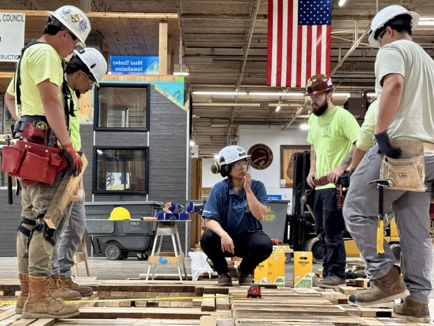Workers assemble and test Re-SPLAM at the Mid-America Carpenters Regional Council training facility in Chicago. (Photo: Hongxi Yin)