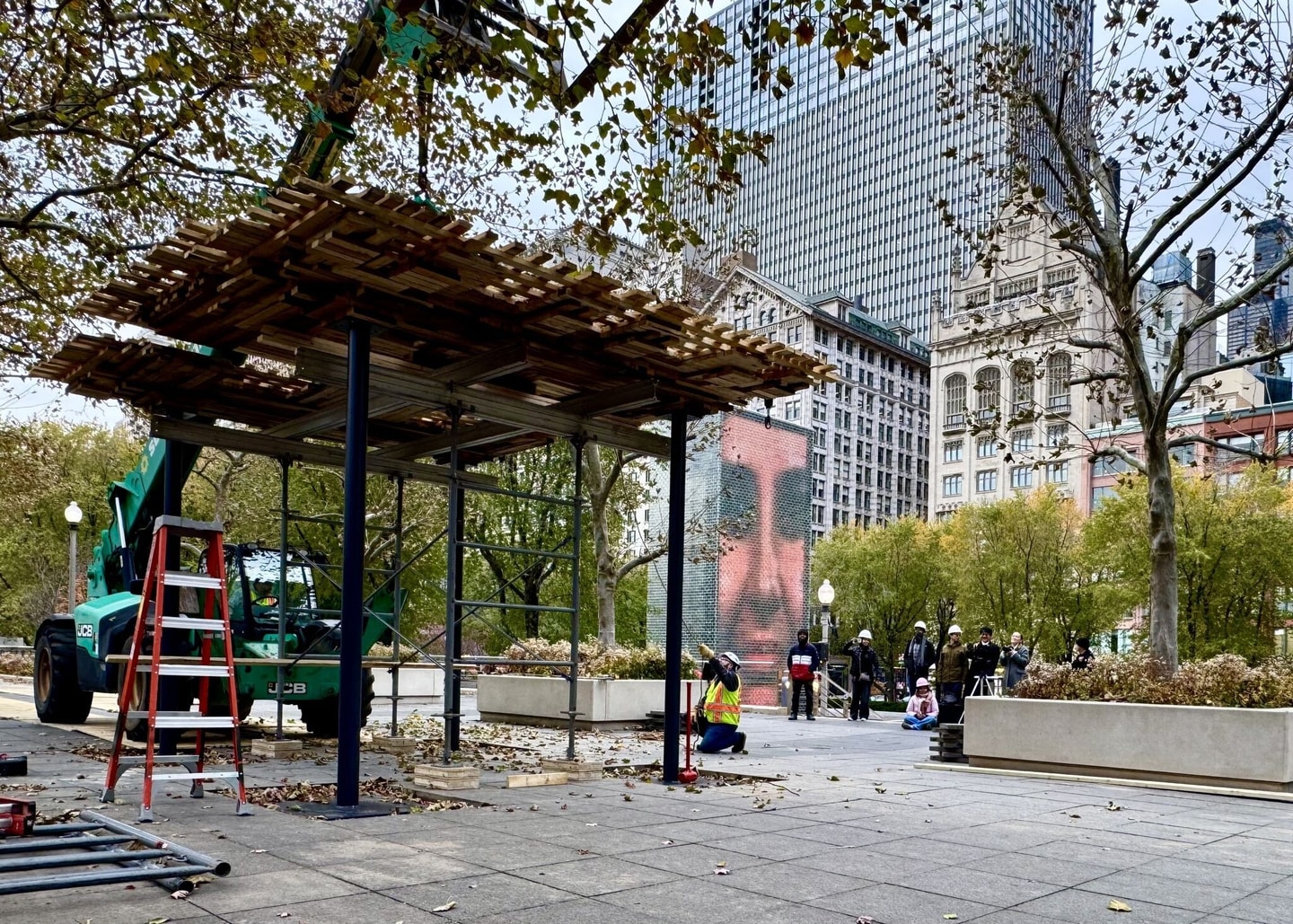 Recently, Yin and Sam Fox School students partnered with SOM, the iconic Chicago architectural firm, to research, design and construct a temporary pavilion for the Chicago Architecture Biennial. On view through late February in Millennium Park, just steps from Anish Kapoor’s beloved “Cloud Gate” (aka “The Bean”), the project is built entirely from salvaged materials.