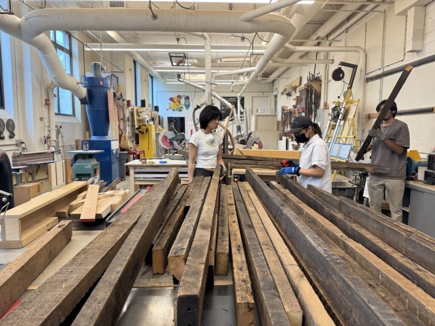 Sam Fox School students Bao Nguyen (left), Xinyu (“Rain”) Zhao and Andres Fernandez-Aguilar sort, scan and catalog reclaimed timber in Givens Hall. (Photo: Hongxi Yin)