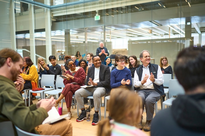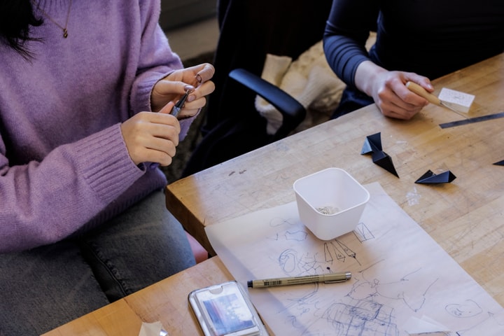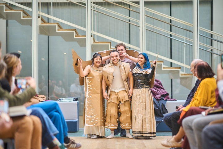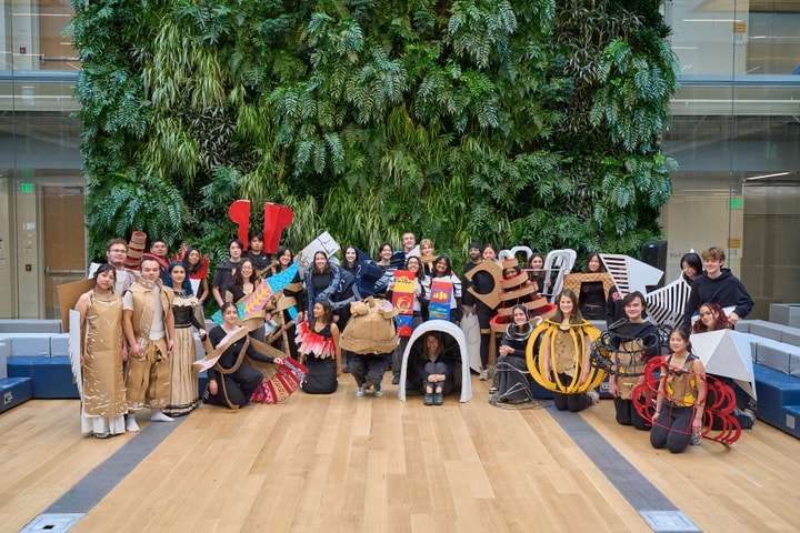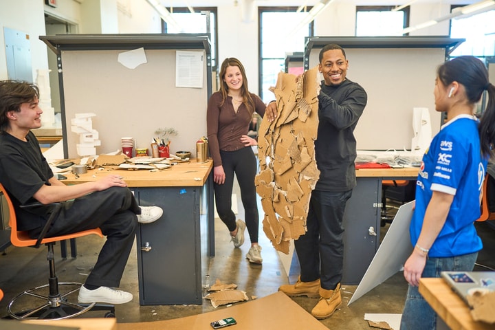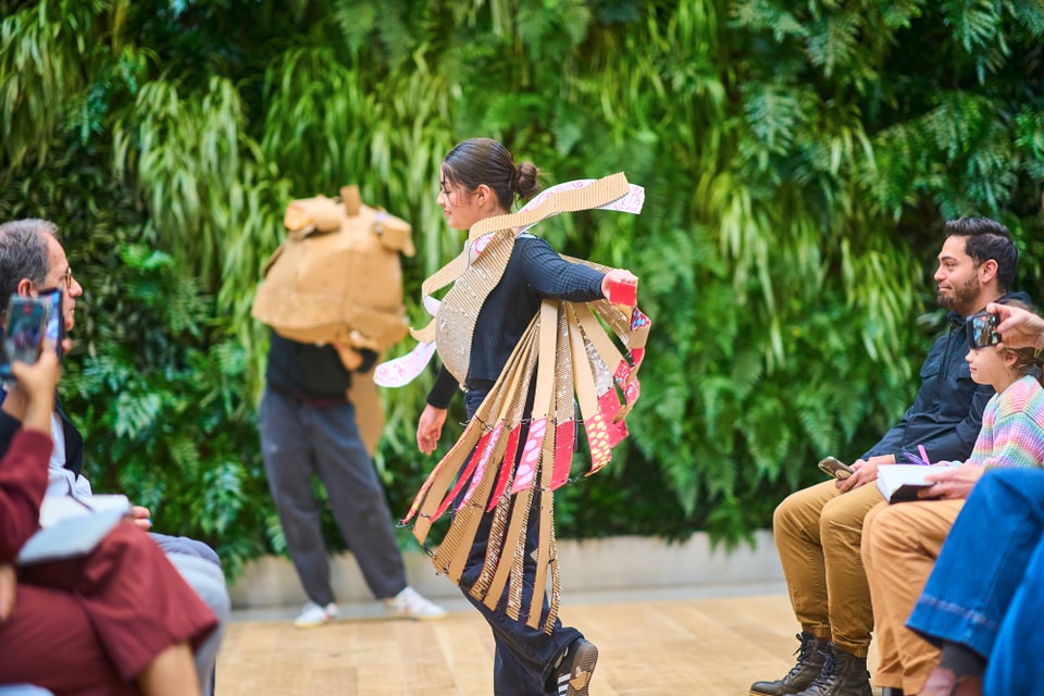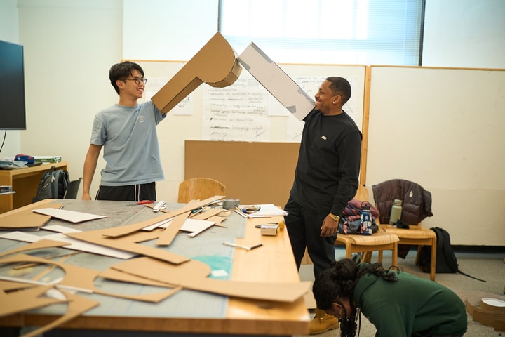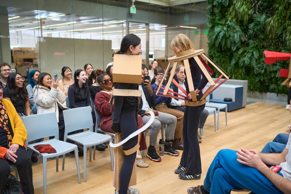 Rome Prize-winning architect Germane Barnes led the Laskey Charrette, sharing a prompt that centered the human body as a core building to be adorned. Student teams selected thematic words from a provided list, then designed a garment informed by those words for each one of their team members to wear. An additional requirement was that each garment covered at least one-third of an individual, and the prompt noted that the more ambitious and collaborative the work, the better. Barnes called the charrette “The Bauhaus Ballet, (but in St. Louis),” in reference to artist Oskar Schlemmer’s “Triadic Ballet.”