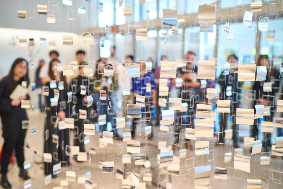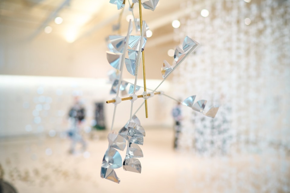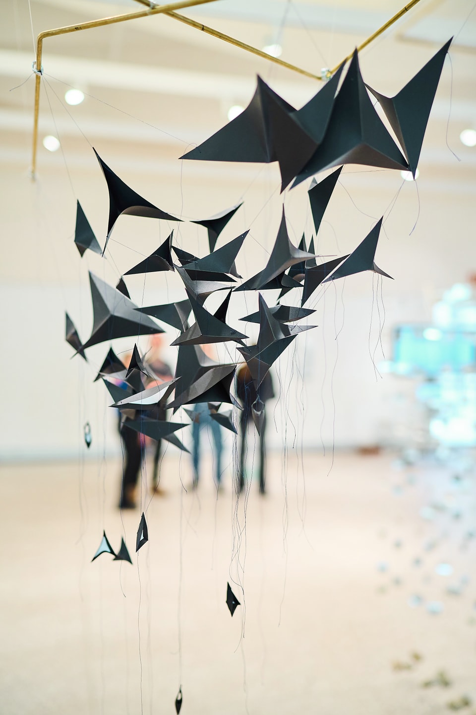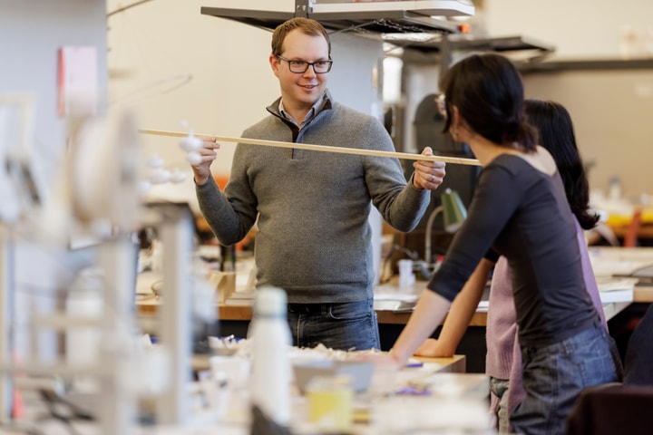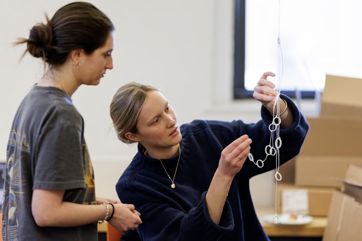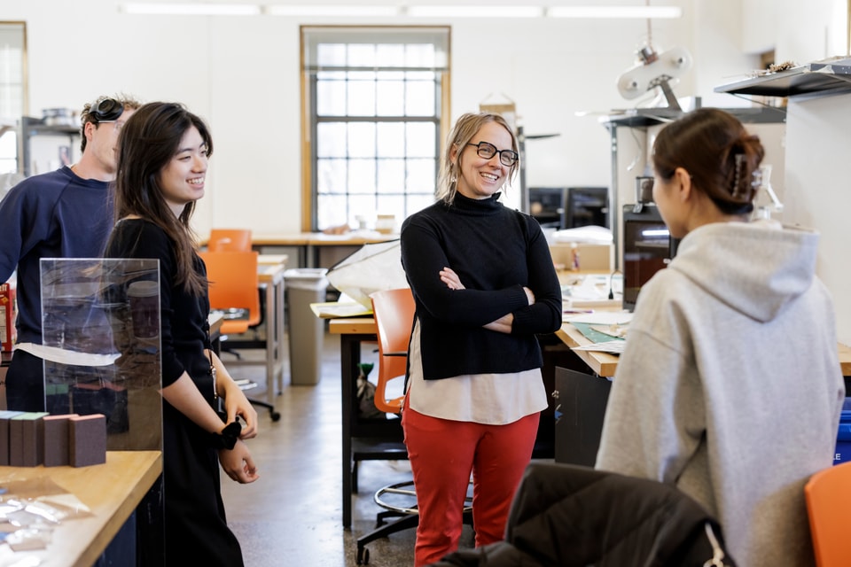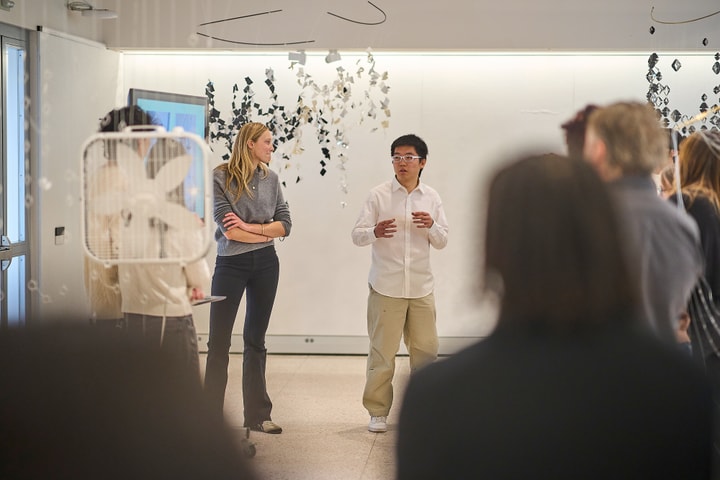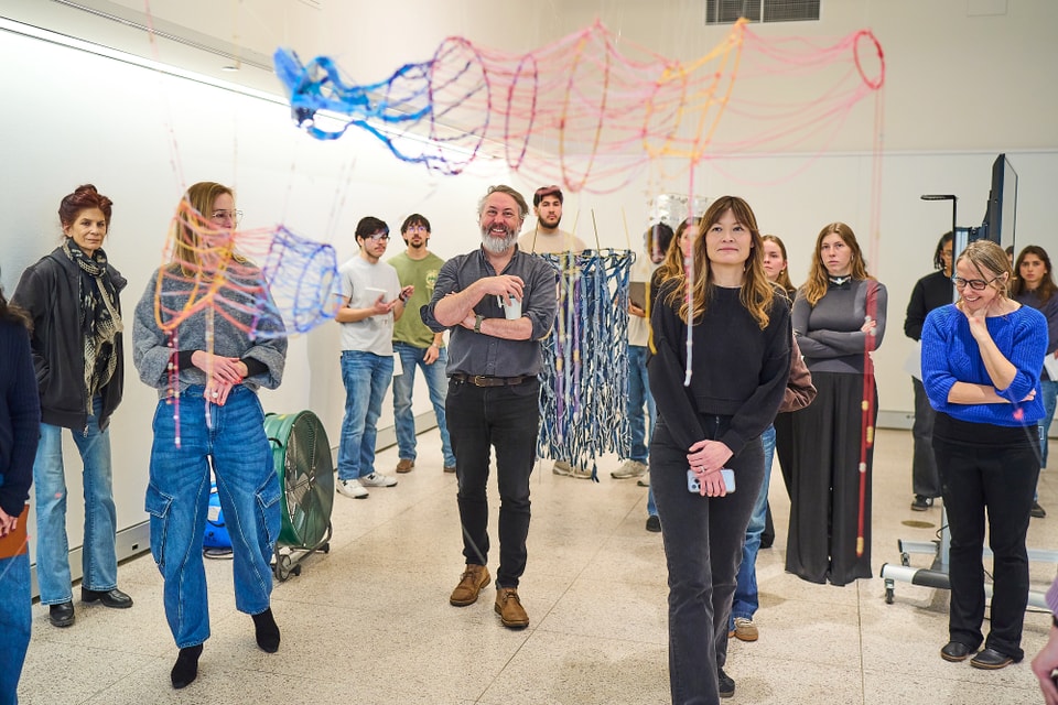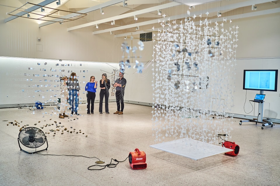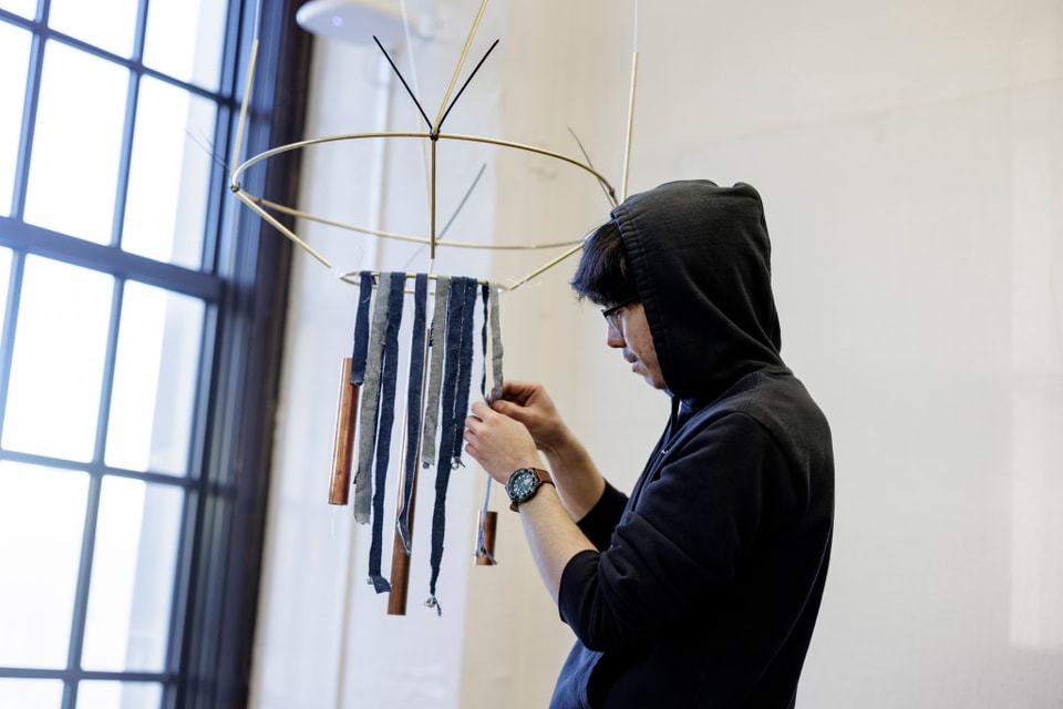 Catie Newell, architect and professor at the University of Michigan, led the Fitzgibbon Charrette. Her prompt, “Air Space,” asked students to closely consider flowing air, allowing spaces to breathe. Students began by making components that are pliable to air — laser- and hand-cut paper, very thin wood, and 3D printed nodes — then attaching them together to form an aggregate, suspending them from above, and working to form larger collections. Newell described the final installations as operating at the scale of architectural openings with air as the occupant, considering material qualities, weather, and relevant geometries while remaining attentive and aware of our planet and its atmosphere.